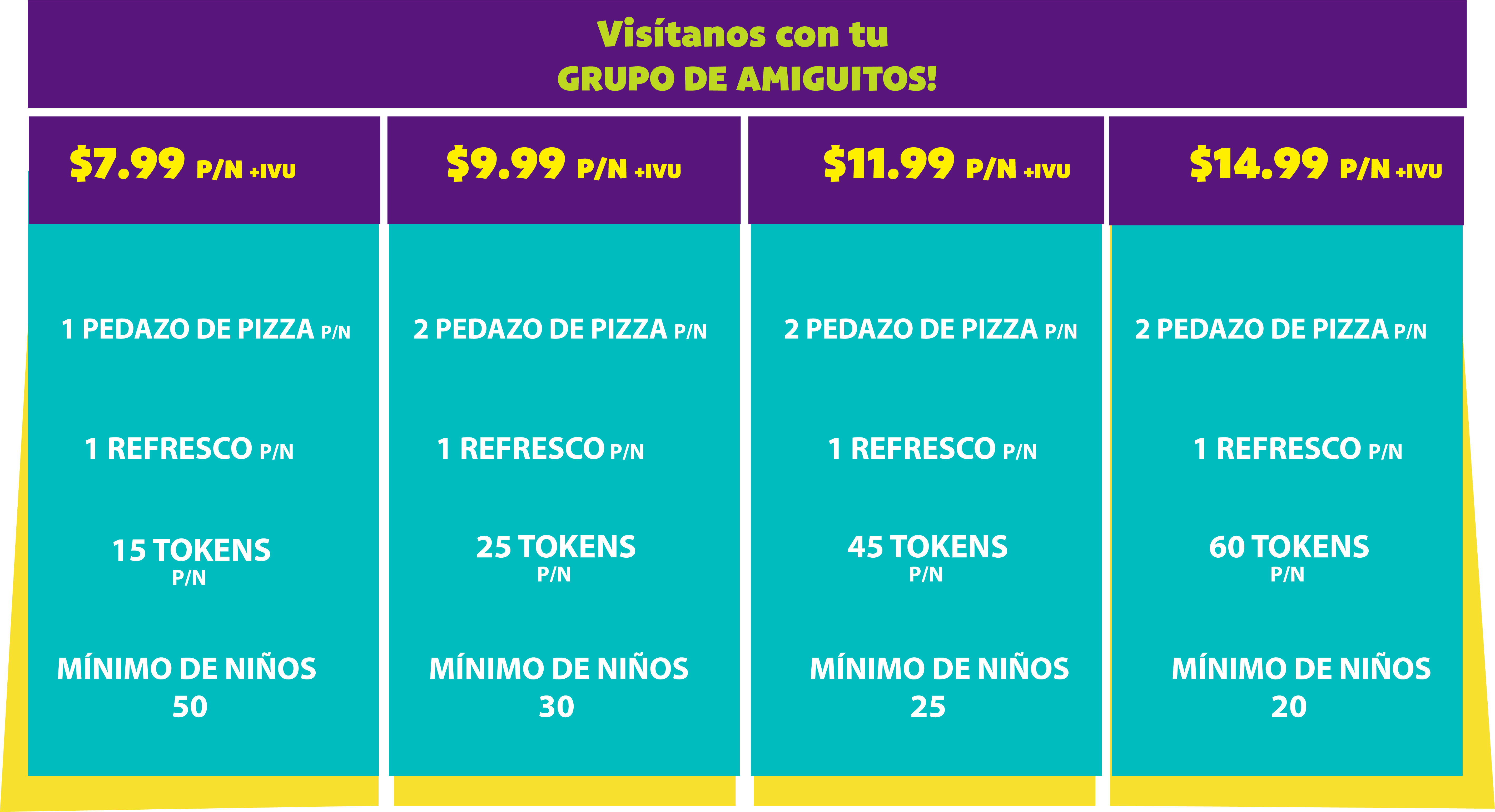 Para rematar, con los 4 paquetes grupales que ofrecemos, cada niño reservado en su grupo podrá disfrutar de dos pedazos de una pizza de primera y refresco ilimitado. Si necesita otras opciones de menú para niños para su fiesta, puede agregar otros alimentos del mejor menú para niños, como nuestrs breadsticks o postres. Si tiene adultos con su grupo que buscan algo un poco más ligero, también ofrecemos una variedad de sándwiches y wrap.